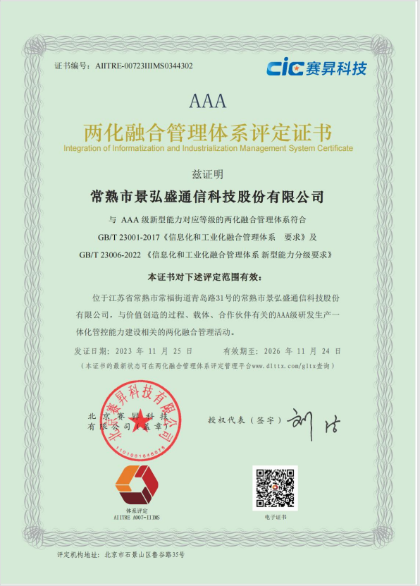兩化融合管理體系評定證書